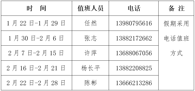 为方便退休教职工和学校各部门在假期联系退休人员管理工作,现将退休人员工作处假期值班安排如下: