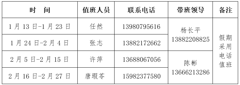 值班期间值班人员保持电话通畅,涉及相关工作要及时处理,如遇重大事情必须向部门领导和主管校领导请示汇报。